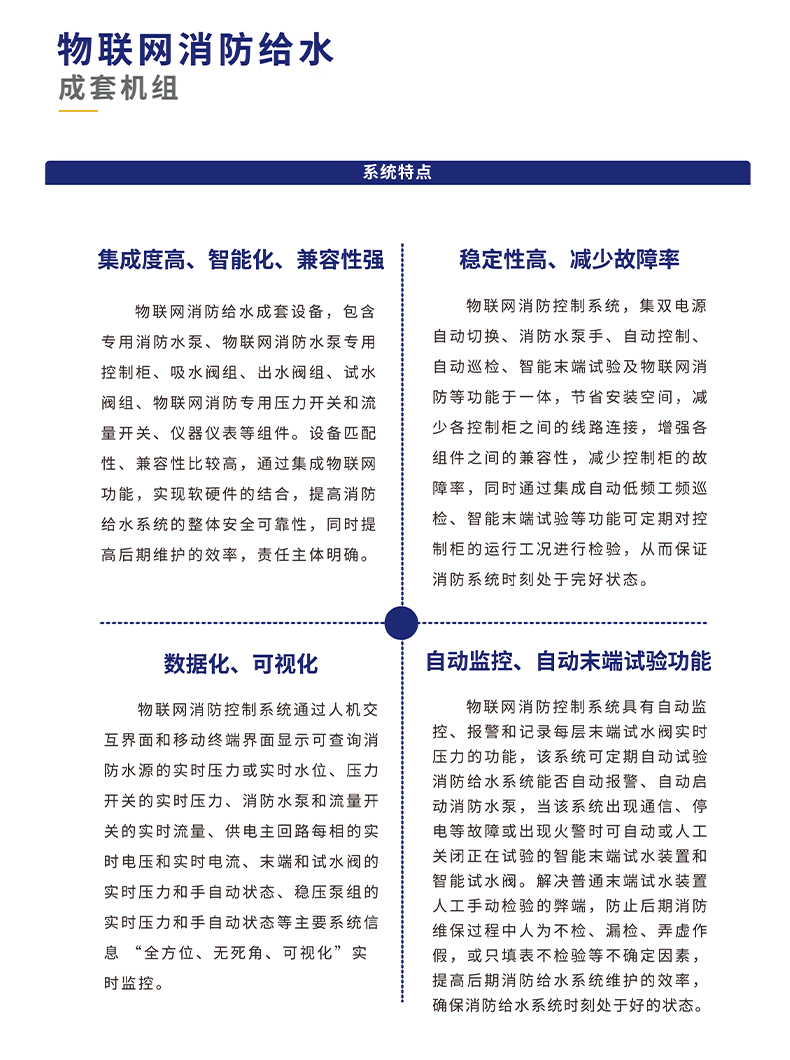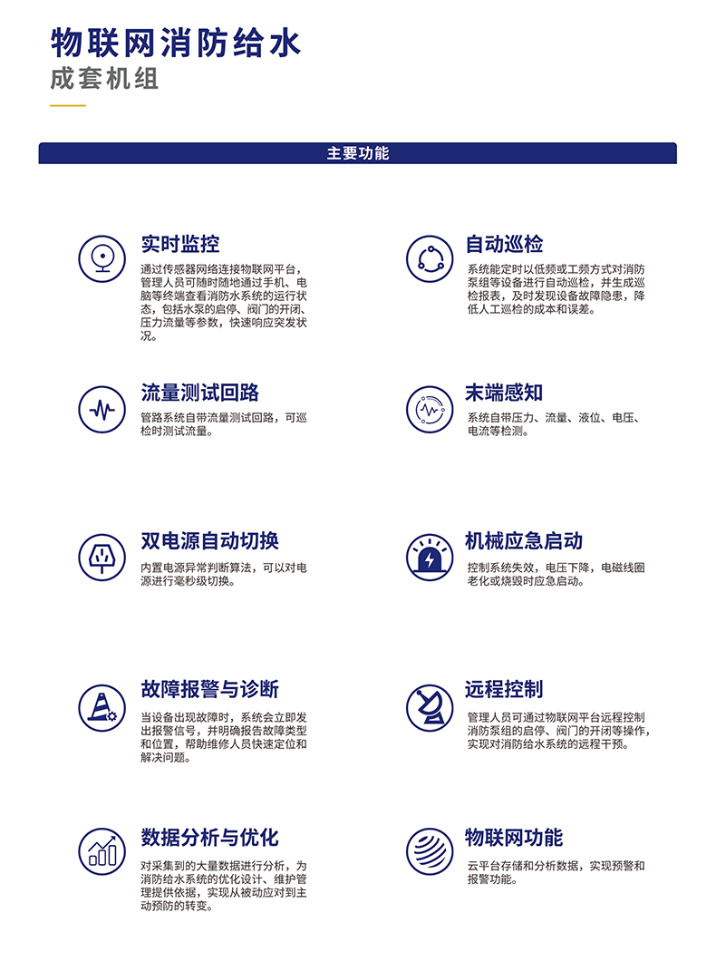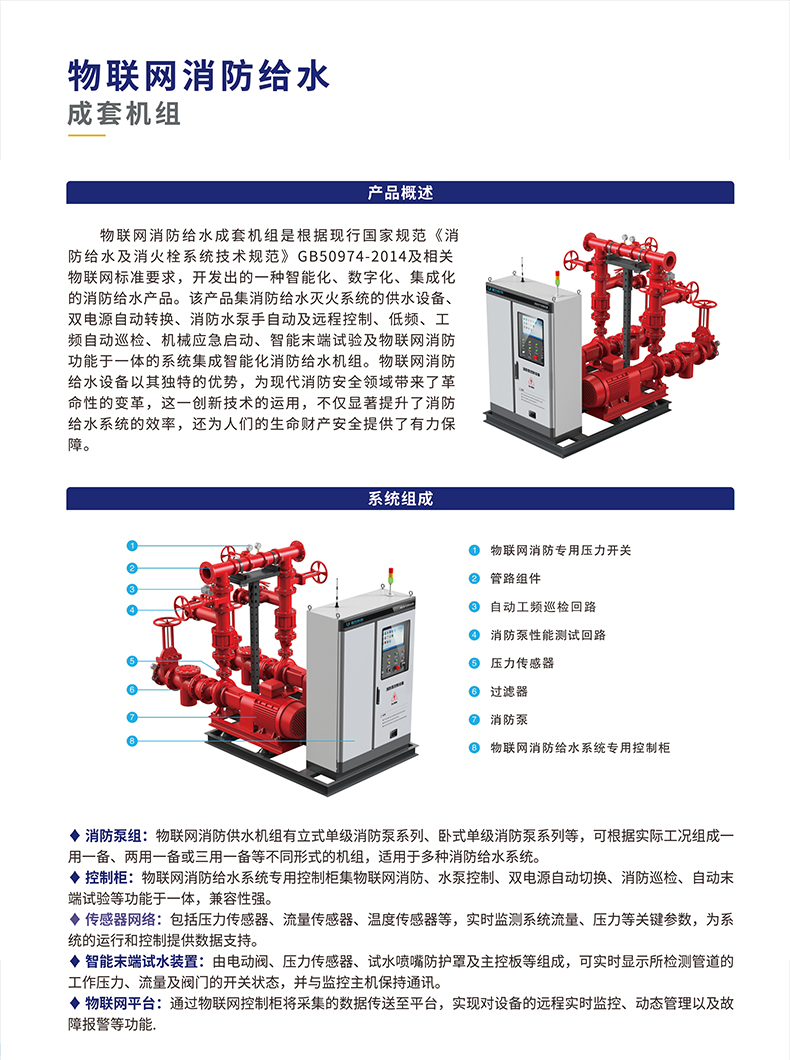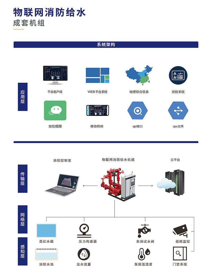 與之形成鮮明對比的是,物聯(lián)網消防給水機組借助先進的物聯(lián)網技術,實現(xiàn)了對系統(tǒng)的全方位實時監(jiān)控。傳感器網絡如同密布的神經末梢,時刻感知著系統(tǒng)內的壓力、流量、溫度等關鍵參數(shù),并通過物聯(lián)網平臺將這些數(shù)據實時傳輸給管理人員。無論身處何地,管理人員只需通過手機、電腦等終端設備,便能清晰掌握消防水系統(tǒng)的運行情況,真正做到了對系統(tǒng)狀態(tài)的了如指掌。