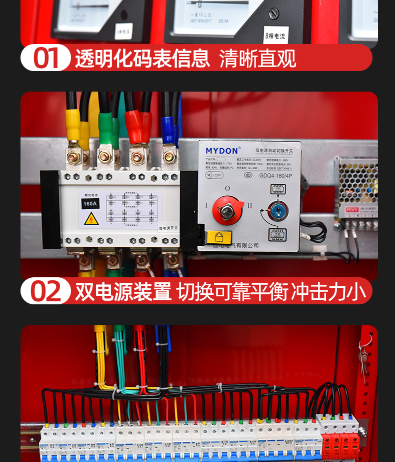 雙電源動力柜(ATS柜,Automatic Transfer Switch)是一種用于變電站或重要電力負荷的配電設(shè)備,可在兩路獨立電源(如市電與發(fā)電機、主電源與備用電源)之間自動或手動切換,確保供電連續(xù)性。變電站消防控制系統(tǒng)引接兩路獨立的站用電源,經(jīng)雙電源切換后,通過柜頂交流電源母線為所有消防相關(guān)設(shè)備供電,并為消防輔控設(shè)備提供DV24V電源。主要由控制部分、電源選擇部分、主電路分支部分、備電路分支部分等組成。其作用是在主電源出現(xiàn)故障或者停電的情況下,自動將備用電源接入電網(wǎng),保證供電的連續(xù)性和穩(wěn)定性。同時,雙電源柜還可以定時測試備用電源及其供電系統(tǒng)的性能,確保備用電源的正常運行。