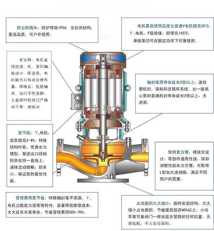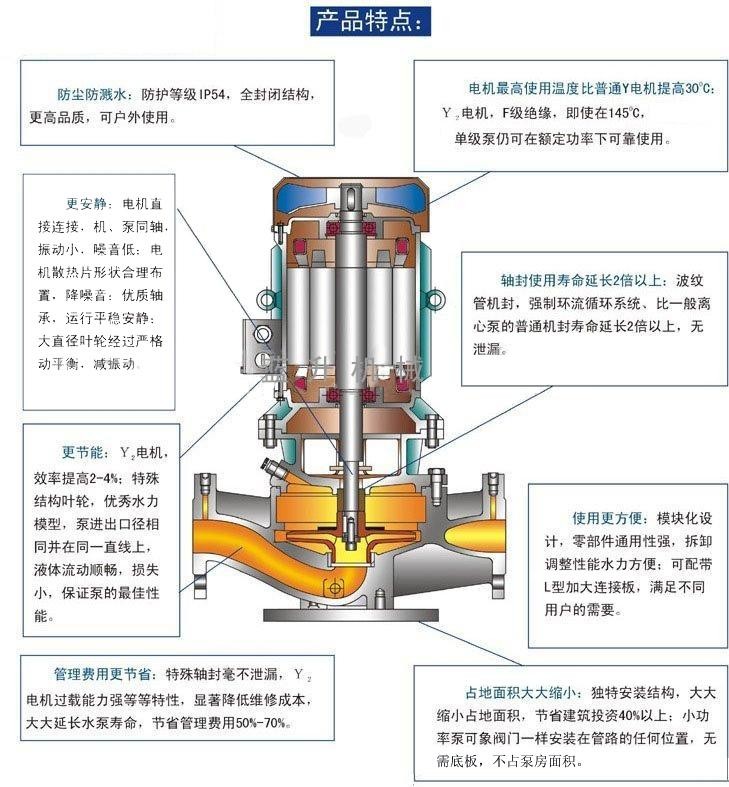 ISG型立式單級(jí)管道離心泵又稱單級(jí)離心泵、管道泵、管道離心泵、立式離心泵、清水泵、增壓泵、循環(huán)泵、穩(wěn)壓泵等,是我廠技術(shù)研究所聯(lián)合國(guó)內(nèi)水泵專家選用國(guó)內(nèi)優(yōu)秀水力模型,采用IS型離心泵和SG型管道泵之性能參數(shù),在一般立式水泵的基礎(chǔ)上進(jìn)行巧妙組合設(shè)計(jì)而成,同時(shí)根據(jù)使用溫度、介質(zhì)等不同在ISG型系列管道泵的基礎(chǔ)上派生出熱水管道泵、高溫耐腐蝕化工管道泵、管道油泵。該系列產(chǎn)品具有高效節(jié)能、噪音低、性能可靠等優(yōu)點(diǎn)。符合最新國(guó)家機(jī)械部JB/T53058-93的標(biāo)準(zhǔn)要求,按國(guó)際ISO2858標(biāo)準(zhǔn)設(shè)計(jì)制造。